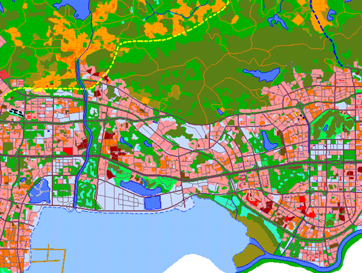 为了提高预测精度和减少无线网络规划工程师的工作量,更多的是采用计算机程序来预测传播损耗和所覆盖的区域。路径损耗的预测,和基站周围的地形、地物、距离密切相关,因此我们可以把地形、地物等信息存储在电子地图中,计算机在运算时可以随时调用这些信息。图2是某地的电子地图,图中不同颜色表示的是不同的地物。