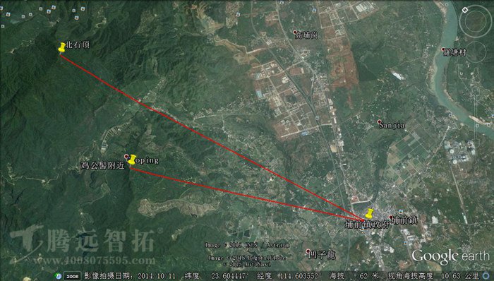 这是一个在广东省河源市埔前镇的森林防火无线传输项目现场测试,在埔前镇上的北石顶和鸡公髻这两座山的最高处上各安装一个监控点,监控室设施在埔前镇政府办公室里,以两座山的监控点作为发射点,将监控视频传输到监控室里;北石顶和鸡公髻与监控室的距离分别为9公里与6公里。